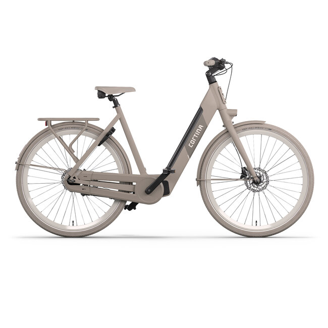 Cortina E-Nite elektrische unisex-fiets in framemaaten 50 Cm/57 Cm. Kleur Warm Sand Matte. Uitgerust met achter een Shimano Nexus 7-traps versnellingsnaaf en met voor en achter hydraulische schrijfremmen. Werkt met een SportDrive 36v systeem met middenmot Lees meer.